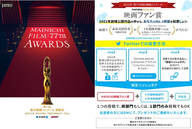 なお、「TSUTAYA DISCAS映画ファン賞2022」応募フォーム、またはTwitterよりご投票いただいた方の中から抽選で1.「毎日映画コンクール」表彰式招待券10組20名様、2.「TSUTAYA DISCAS定額8プラン1年間無料」を10名様、3.TSUTAYA DISCAS単品レンタルチケットを100名様にプレゼントいたします。投票方法の詳細は上記「応募ページ」をご参照下さい。