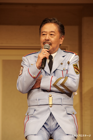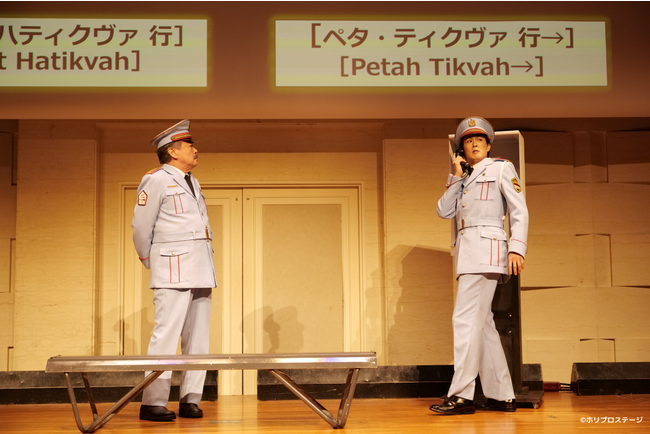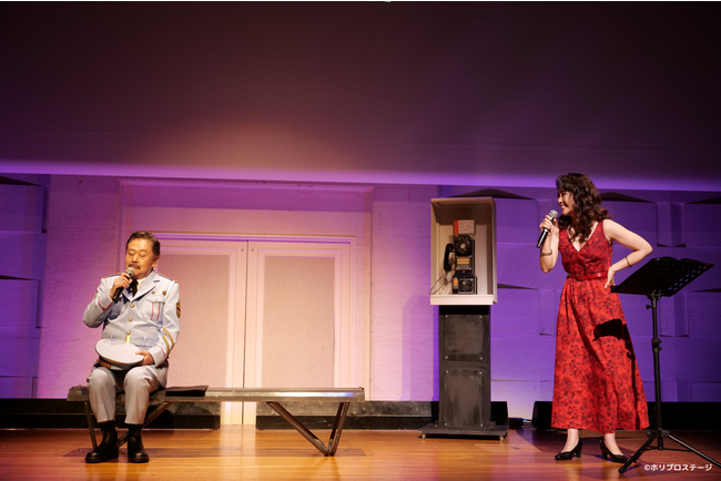 スクリーンには場面説明が投影され、警察音楽隊の指揮者・トウフィーク役の風間とトランペット奏者・カーレド役の新納が登場。