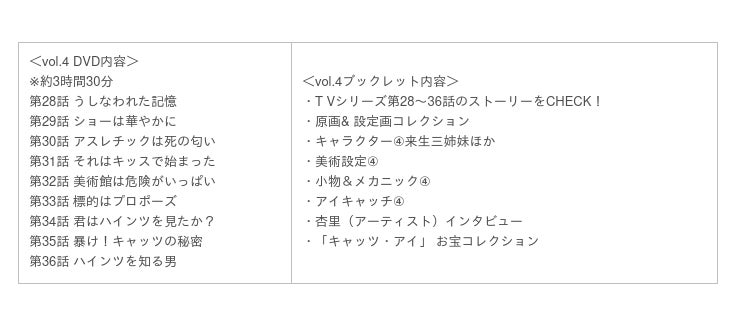 vol.4のブックレットには、国民的アニソンとして今も多くの人たちに歌われている主題歌『CAT'S EYE』を歌う杏里が登場。主題歌を歌うことになったきっかけ、妖艶な映像でファンを沸かせたエンディング曲『Dancing with the sunshine』の印象、さらには『ルパン三世VSキャッツ・アイ』についても語っています。