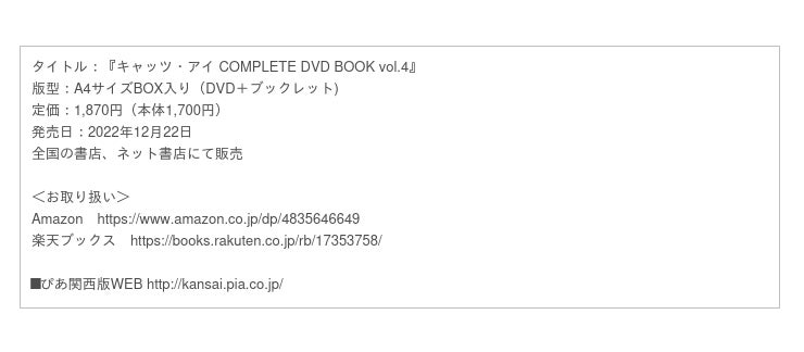 ぴあ株式会社より、『キャッツ・アイ COMPLETE DVD BOOK』全4巻が、9月22日より、月1ペースで刊行スタート。このたび、最終巻となるvol.4の表紙を解禁。併せてネット書店での予約も開始します。