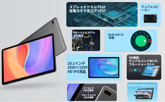 NPad Air」は、UNIOC製T310ッサーを搭載ています。最先端の12nmプロセスにコアパイロット技術を加え、2.0GHzの高性能と高い周波数を維持しながら、低消費電力と低発熱を実現し、終始持続的な高性能と信頼性の高いユーザ体験を提供しています。4GB RAMで、マルチタスクやアプリの切り替えもスムーズに。64GBのストレージスペースと1TBのMicro SDカードを追加して、データを整理することができます。