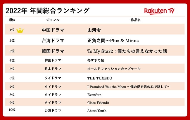 「Rakuten TV」年間総合ランキングでは、中国ドラマ『山河令』が1位を獲得しました。男性同士の熱い友情を描いた「ブロマンス」と「時代劇」を掛け合わせた作品で、今年の上半期ランキングに引き続き人気が継続しています。