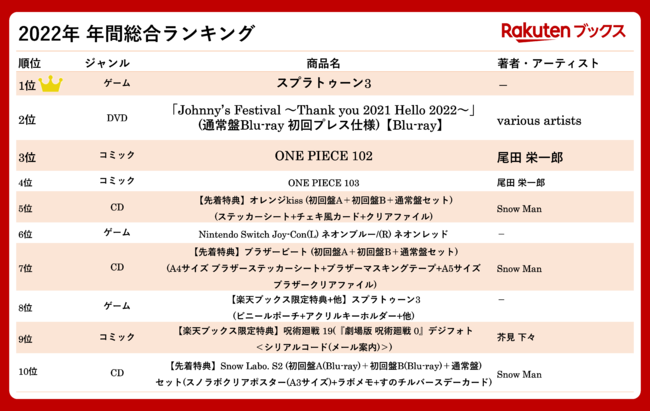 「楽天ブックス」年間総合ランキングで1位となったのは、初心者でも楽しめるゲームであることから話題を呼び、前作の『スプラトゥーン2』の約8倍 (注2)の売り上げとなったゲームソフト『スプラトゥーン3』でした。また、同作品に「楽天ブックス」限定特典が付属した商品も8位にランクインし、高い人気を集めました。2位にランクインした『「Johnny’s Festival 〜Thank you 2021 Hello 2022〜」(通常盤Blu-ray 初回プレス仕様)【Blu-ray】』は、3位だった上半期ランキング(https://corp.rakuten.co.jp/news/update/2022/0627_01.html )から順位を上げています。さらに、ジャニーズ事務所所属アーティストであるSnow Manが3作品(5位、7位、10位)ランクインし、人気の高さがうかがえます。また、3位と4位には、「週刊少年ジャンプ」の名作コミック『ONE PIECE』の102巻と103巻がそれぞれランクインし、根強い人気が継続しています。