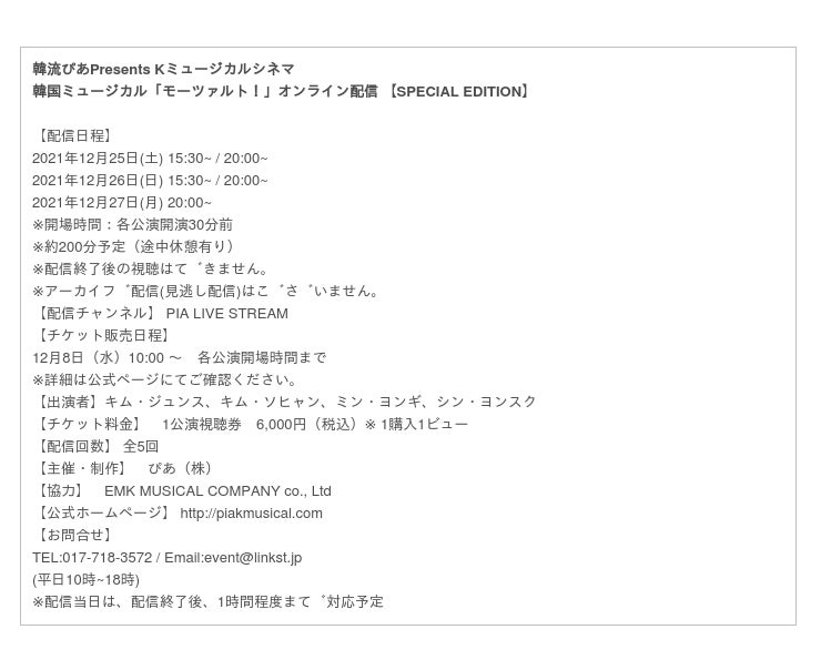2020年8月、「PIA LIVE STREAM」と「uP!」にて配信し、日本国内だけで15000人以上が視聴したことでも話題となった韓国ミュージカル『モーツァルト!』。そのスペシャルエディションが、2021年12月25日(土)・26日(日) ・27日(月)の3日間、日韓同時配信される。日本では、オンライン配信動画サービス「PIA LIVE STREAM」にて日本語字幕付で配信されることが決定した。