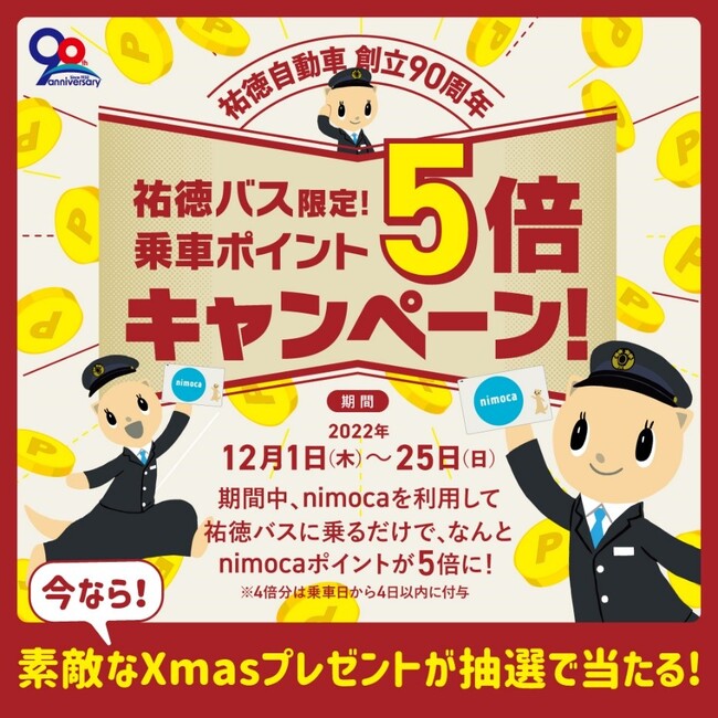 株式会社ニモカ(所在地:福岡県福岡市、代表取締役社長:田端 敦)と祐徳自動車株式会社(所在地:佐賀県鹿島市、代表取締役社長:愛野 時興)は、祐徳自動車の創立90周年を記念し、2022年12月1日(木)から12月25日(日)まで日頃の感謝を込めて「乗車ポイント5倍キャンペーン!」を実施いたします。
