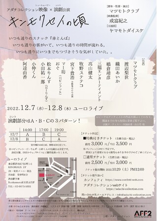 アダチコレクション(代表:阿達由香)主催、『キンモクセイの頃』が2022年12月7日 (水) 〜2022年12月8日 (木)にユーロライブ(東京都渋谷区円山町1-5KINOHAUS 2F)にて上演されます。 チケットはカンフェティ(運営:ロングランプランニング株式会社、東京都新宿区、代表取締役:榑松 大剛)にて発売中です。