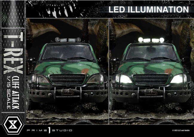 T-REXに崖から落とされたトレーラー。その中にいたイアン・マルコムとサラ・ハーディングの両博士を救うべく、エンジニアのエディ・カーは降りしきる雨の中SUVのエンジンを回す。しかし孤軍奮闘するエディを取り囲むように危機の元凶が現れて・・・。プライム1スタジオがジオラマのテーマに選んだのは、この印象深いワンシーンです。