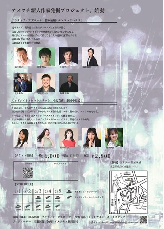 アメツチ新人作家発掘プロジェクト『ウブスナvol.1』が2023年2月1日 (水) 〜2023年2月5日 (日)にシアターKASSAI(東京都豊島区東池袋1-45-2)にて開催されます。 チケットはカンフェティ(運営:ロングランプランニング株式会社、東京都新宿区、代表取締役:榑松 大剛)にて12月1日(木)19:00より発売開始です。