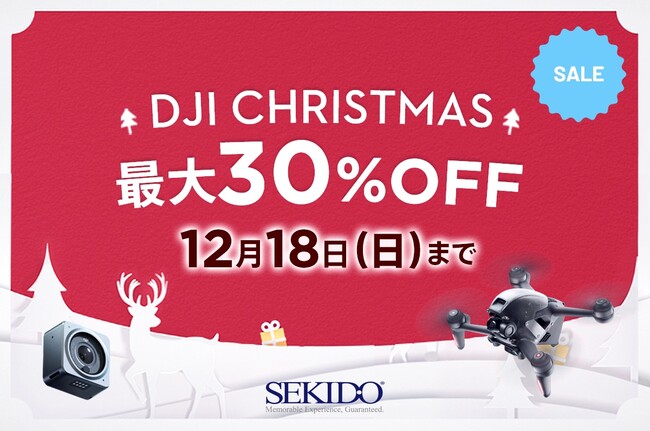 日本初のDJI正規販売代理店である株式会社セキド(本社:東京都港区、代表取締役:大下貴之)では、2022年12月18日(日)までの期間限定で、鳥のように自由に空撮が可能な 4K対応高性能小型FPVドローン「DJI FPV(ディージェーアイ エフピーブイ)」と超小型/超広角の美しいウェアラブルアクションカム「DJI ACTION 2(アクション 2)」が、最大 30%OFFとなるセールキャンペーン「DJI CHRISTMAS|DJI クリスマス」を開催いたします。 臨場感と安定性を両立した印象的な空撮が可能な DJI FPV と、マグネットシステムでどこにでも手軽に設置して、日常を切り取るライフログアクションカメラ DJI Action 2 で、ウィンターホリデーは新しい視点からの撮影を楽しんでみませんか?