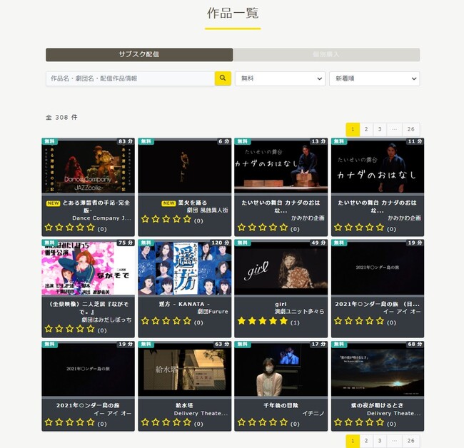 また、無料会員は全作品の冒頭3分間のお試し動画をご視聴いただけます。無料配信作品が300作品以上あり、柿喰う客「天邪鬼」やMONO「約三十の嘘」などの人気作品を配信しています。