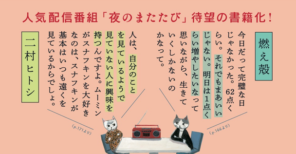 株式会社ジャパンエフエムネットワーク(以下、JFNC)が制作しているAuDee配信番組「夜のまたたび」(https://audee.jp/program/show/100000029)では、人気作家・燃え殻、稀有な存在感を放つ AV 監督・二村ヒトシ、 両氏によって優しくて、面白くて、少しだけ役に立つトークが繰り広げられてきました。番組がスタートしてから3年。二人が交わしてきたその"真夜中の禁断トーク"をさらに優しく、読みやすく構成し直し、株式会社マガジンハウス社より刊行する運びとなりました。疲れた夜に読むと、「こんな自分だってまだ生きてて大丈夫」と、微かな安堵感と、"明日への活力"を 得られること請け合いの一冊です。