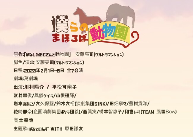 ROOKIES出演俳優の川村陽介主演、劇団ウルトラマンション安藤亮司とのタッグ作品。舞台「僕らのまほろば動物園」平松可奈子、山根理輝などの追加キャスト発表!