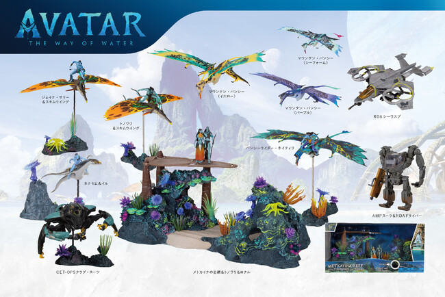 『アバター』と『アバター:ウェイ・オブ・ウォーター』に登場するキャラクターやクリーチャー、ビークルを、造形や質感にこだわり、7インチスケールで立体化。主人公のジェイク・サリーやネイティリなどナヴィのキャラクターは全高約18センチの大きさで、人間やクリーチャーなどは同スケールに合わせたサイズとなっている。ナヴィはクリーチャーに、人間はビークルにそれぞれ乗せて遊ぶことが可能。また、約22箇所の可動ポイントを設けており、武器やアクセサリーなどの付属品と組み合わせて、多種多様なディスプレイができる。さらに、ブラックライトを当てると発光するギミックが搭載されており、劇中の幻想的な姿を再現可能。パッケージは、そのまま飾ってもカッコいいウィンドウボックス仕様となっている。
