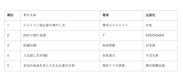 書籍では、変化の大きかった世界情勢や経済動向の影響を受けて、お金に関する本に注目が集まり、『ジェイソン流お金の増やし方』が1位となりました。コミックは、昨年に引き続き、映像化でヒットした作品が上位を占める結果となり、『呪術廻戦』が首位を獲得しました。