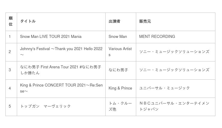 DVD/Blu-ray・CD販売では、ともにSnow Manがランキング1位となり、2022年の活躍を表した結果となりました。また、ジャニーズ作品が上位を多く占め、なにわ男子、King & Prince、SixTONESと人気を誇るアーティストが並ぶほか、累計興行収入130億円を超えた話題作『トップガン マーヴェリック』も5位にランクインしました。
