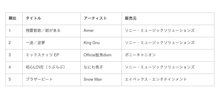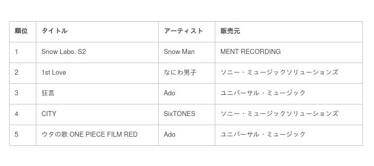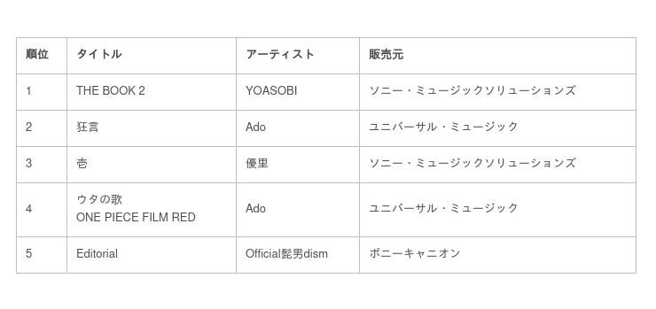 音楽では、YOASOBIの2作目のEP(Extended Play)が1位となり、昨年のファーストEPに続いて2年連続の首位獲得で不動の人気を示す結果となりました。また、シングルでは、1位から3位までが『鬼滅の刃』『呪術廻戦』『SPY×FAMILY』と、社会現象にもなったアニメ作品の主題歌となっており、人気作品の影響が強く出た1年となりました。