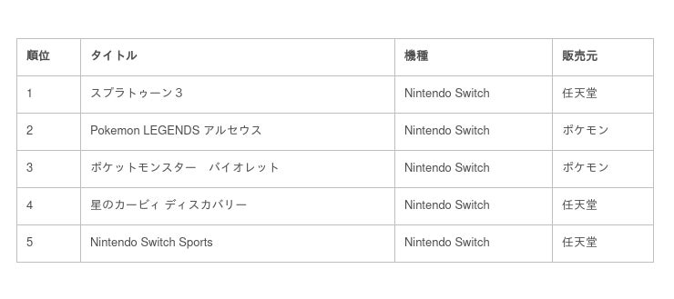 ゲームでは、昨年に続きNINTENDO Switchのタイトルが上位を席巻しており、子どもから大人まで幅広い年齢層から支持を集めている『スプラトゥーン3』が1位となりました。