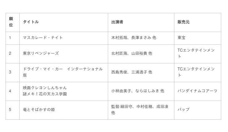 映像では、邦画勢が上位5位を占め、東野圭吾のベストセラーを木村拓哉と長澤まさみの主演で映画化した『マスカレード・ホテル』の続編『マスカレード・ナイト』が1位に。また、日本アカデミー賞で最優秀作品賞を受賞、さらに第94回米アカデミー賞で邦画初となる作品賞を含む4部門にノミネートされ、邦画では13年ぶりとなる国際長編映画賞を受賞して話題となった『ドライブ・マイ・カー インターナショナル版』が3位となりました。