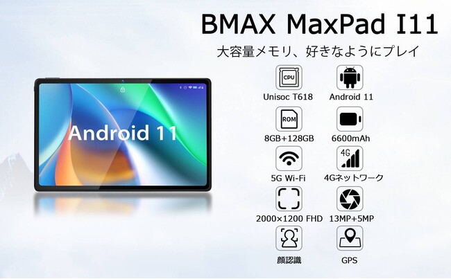 Android 11 タブレット 10.4インチ MaxPad I11 8GB RAM+128GB ROM 8コア CPU 2.0GHz , 2K 2000*1200 IPSディスプレイ 4G LTE Dual SIM 2.4GHz/5GHz Wi-Fiモデル 1TB MicroSD拡張可能 6600mAh 2スピーカー Bluetooth5.0+顔認識+GPS FM搭載