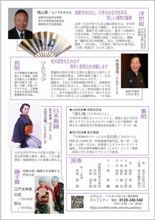 武蔵野邦楽合奏団主催、『浮世絵とたのしむ和の音色・舞踊』が2023年1月14日(土)に武蔵野芸能劇場(東京都武蔵野市中町1丁目15-10)にて開催されます。 チケットはカンフェティ(運営:ロングランプランニング株式会社、東京都新宿区、代表取締役:榑松 大剛)にて12月14日(水)10:00より発売開始です。