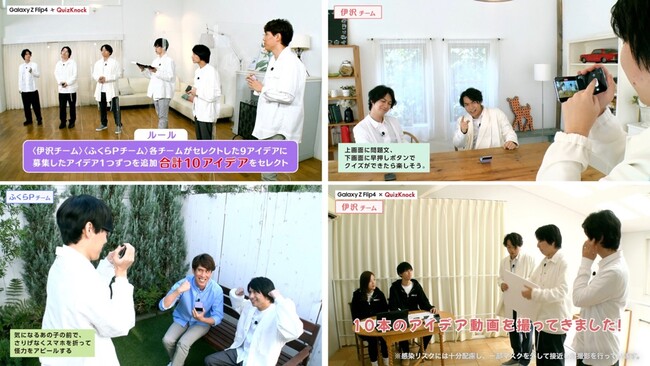 Twitterにてみなさんから寄せられた、4,000件以上の折りたたみスマホの新しい使い方のアイデアから、先日Galaxy公式YouTubeチャンネルにて実施された「徹底生会議!」のライブ配信にて、QuizKnockさんが映像化するアイデアを選定いたしました。そして今回、選定した20個のアイデアの中から16個のアイデアをQuizKnockさん自らが映像監督となり、演出を考え、実際に「Galaxy Z Flip4」を使用して撮影し、映像化していただきました。撮影した映像は本日よりGalaxy 公式YouTubeチャンネルにて公開中です。QuizKnockさんのアイデアを活かしながら映像化した、「Galaxy Z Flip4」の「折りたためる」からこそできる意外な活用法や新たな可能性をお楽しみください。