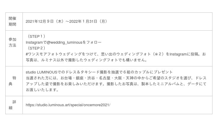タメニー株式会社(本社:東京都品川区、代表取締役社長:佐藤茂、証券コード:東証マザーズ6181)のグループ会社であるタメニーアートワークス株式会社(代表取締役社長:福井秀幸)が運営する、フォトウェディングブランド「studio LUMINOUS」 (URL:https://studio.luminous.art/)は、2021年11月にサービス開始3周年を迎えたことを記念し、12月9日より「The 3rd Anniversary Campaign」を実施することとしましたので、お知らせいたします。 なお、「The 3rd Anniversary Campaign」では、フォトウェディングを2回実施される新郎新婦様が増加(※1)している現況を踏まえ、「Once more Photo Wedding」 と位置づけた新たなセレモニーを抽選でプレゼントいたします。