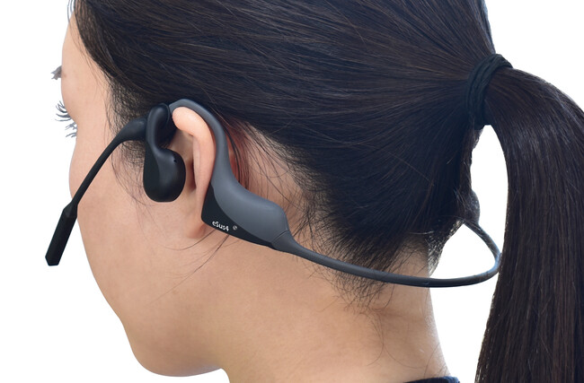 今回開発を進めているテレワーク用ヘッドセット「eSus4(イーサスフォー)」は、耳穴をふさがない「オープンイヤー型」を採用したヘッドセットです。空気振動を利用しているため耳への負担が少なく、周囲の環境音もほどよく聞こえて安全安心に使用することができます。ノイズキャンセル機能搭載のブームマイク付きで、特にテレワークに最適なヘッドセットとなっています。