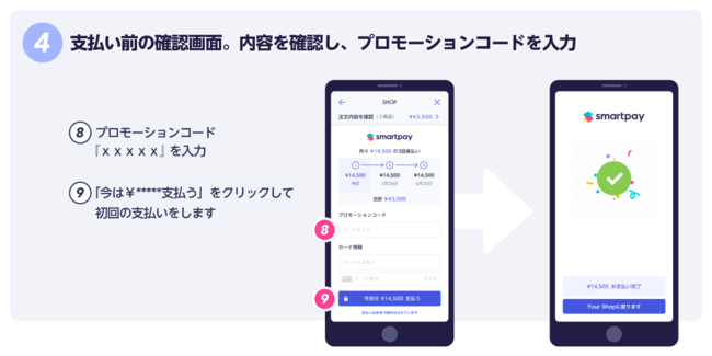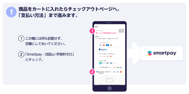「Smartpay」は利息・手数料ゼロで3回の分割後払いができるため、高額商品の購入が従来よりしていただきやすくなります。