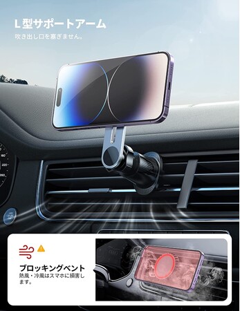 吹き出し口からL字型に設置するデザインで、スマホを背面からしっかりホールドします。スマホが吹き出し口から浮いた形になりますので、風の遮断を最小限に抑えることが可能です。スマホとの接触面にはマット感のある質感の加工を施しました。スマホの背面を傷つけないだけでなく、より見た目にもスタイリッシュなデザインとなっています。