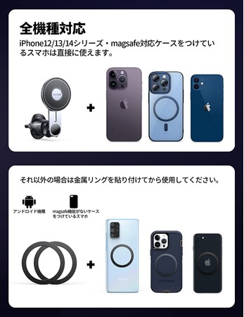 超強力磁石N52磁石を円形状に20個取り付けました。iPhoneユーザーの方で元々MagSafe対応ケースをお使いの方は、そのままスマホホルダーに装着していただけます。MagSafeをお使いでない方は、付属の金属リングをスマホケースに取り付けてお使いください。MagSafeにも対応していますので、付属の金属リングを貼り付けたままでもワイヤレス充電やマグネット充電を使用できます。