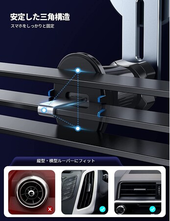 「締め付け防止機能」「滑り止めパット」「アルミ製フック」「三角構造の接地面」はスマホ落下を防ぐための4つの工夫です。締め付け防止機能は、スマホホルダーを強く締めすぎて吹き出し口の羽根の破損を防ぎます。また、バックフックとの接点、上下ルーバーとの接点という3点が固定される三角構造はエンジンのスタート時や急ブレーキなど揺れが発生しても、素晴らしい安定性を発揮。スマホをしっかりホールドして落下を防ぎます。