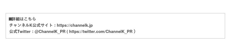公式Twitter:@ChannelK_PR ( https://twitter.com/ChannelK_PR )