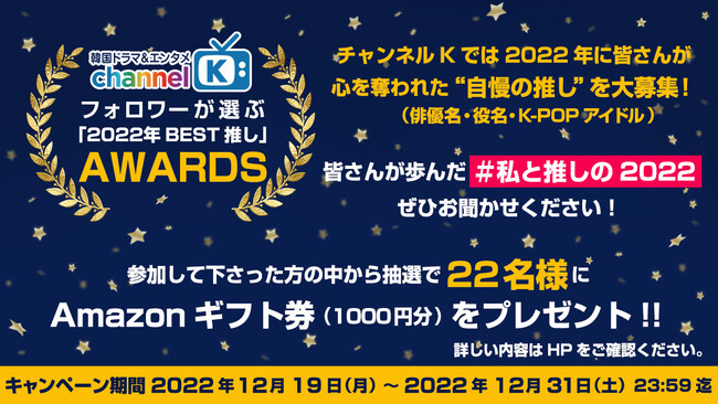 「チャンネルK」では配信のみならず、公式サイトや公式SNSを通じて毎月、様々な韓流スターにまつわる特集やプレゼントキャンペーンを実施しており、その中でも特に大人気の企画が「チャンネルKのフォロワーが選ぶ2022年BEST推しアワード」です。