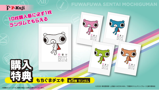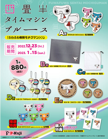 Pアニメストアの運営会社 フィルタ―・インクは【P-Kuji ぴーくじ】のオンラインくじシステムサービスにおいて、2022年12月23日(金) 昼12:00より 四畳半タイムマシンブルース【ふわふわ戦隊モチグマン】くじのオンラインくじを発売いたします。