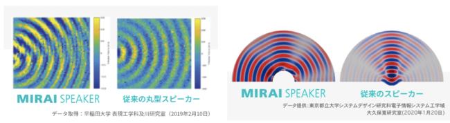 可視化が難しい音波ですが、早稲田大学の協力により、従来のスピーカーとの音波の違いが確認されました。さらに、特有の音波がなぜ生まれるのか、東京都立大学の協力により、振動板の動きからシミュレーション解析を行い、従来のスピーカーとは異なり、高音域において、広範囲にしっかりと音を届ける音場がつくられることが確認されました。今後も、スピーカー100年の歴史を変える『曲面サウンド』の音について研究を続けてまいります。