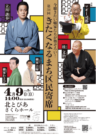 公益財団法人北区文化振興財団主催、『第34回きたくなるまち区民寄席』が2023年4月9日(日)に北とぴあ さくらホール(東京都北区王子1-11-1)にて開催されます。チケットはカンフェティ(運営:ロングランプランニング株式会社、東京都新宿区、代表取締役:榑松 大剛)にて1月19日(木)10:00より発売開始です。