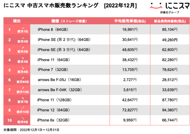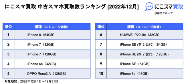 にこスマ|2022年12月中古スマホ販売・買取数ランキング