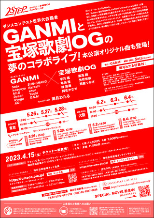 2023年5月26日(金)〜28日(日)に東京・日本青年館ホール、6月2日(金)〜4日(日)に大阪・梅田芸術劇場シアター・ドラマシティにて開催いたします、GANMI×宝塚歌劇OG DANCE LIVE『2STEP』のメインビジュアルを公開いたしました。本公演は、今最注目のダンスアーティスト集団「GANMI」と宝塚歌劇OGのコラボレーションでございます。 Sota[GANMI]・宇月颯・湖月わたるのキャストコメントを公開しております。是非ご注目いただけますと幸いに存じます。どうぞよろしくお願い申し上げます。