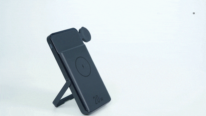 Mytteの裏面には、頑丈なスタンドが搭載されています。さっと引き出すと、バッテリーが一瞬でスマホスタンドに変身!