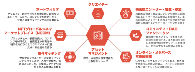 VVAPはクリエイターのコンテンツを資産として永続的に保管可能な分散型ストレージ(IPFS)で管理するアセットマネジメント機能を中心に、クリエイター自身や作品のプロモーションを支援するポートフォリオ機能や、米国アカデミー賞公認・アジア最大級の国際短編映画祭「ショートショート フィルムフェスティバル & アジア」(SSFF & ASIA)に直接エントリー出来るような仕組みを作り、クリエイターや作品の価値の向上をサポート、作品の頒布権、上映権、公衆送信権などの売買を可能にするNFTグローバルシネママーケットプレイス機能などを有します。また、SSFF & ASIAで培ってきたネットワークやノウハウに基づき、ブランディングムービーをはじめ企業の様々なクリエイティブニーズとクリエイターのマッチングや、クリエイターとファンを繋ぐコミュニティやDAOの支援、制作費の資金調達やクリエイター支援のためのファントークン運用の機能の提供、オンライン・メタバースでのコンテンツ視聴環境も提供予定です。