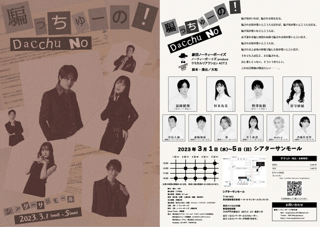 ノーティーボーイズ produce ケミカルリアクション ACT・2『騙っちゅーの!』が2023年3月1日(水)〜5日(日)にシアターサンモール(東京都新宿区新宿1-19-10サンモールクレストB1)にて上演されます。 チケットはカンフェティ(運営:ロングランプランニング株式会社、東京都新宿区、代表取締役:榑松 大剛)にて2月4日(土)10:00よりチケット一般発売開始です。