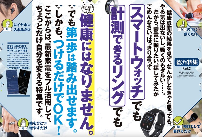 Part.2ではカラダに装着して使う、通称「ウェアラブルデバイス」をピックアップ。スマホと接続すれば、デバイスで計測したデータを体調の可視化や運動の記録などに活用可能。スマートウォッチが有名ですが、最近、新製品が続々登場しているんです!