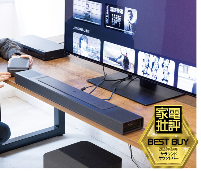サウンドバーとして最高価格帯に近い約14万円の本機は、映画視聴時に本体バーの左右を分離させて、無線接続のサテライトスピーカーにする唯一無二のギミックを採用。サテライトスピーカーはバッテリーを内蔵し、最大10時間駆動するため電源ケーブルも不要です。スピーカー性能も優れ、リア分離時はリアル7.1.4chのユニットとして、本物のドルビーアトモスによる立体音響を楽しめます。実際に体験してみても音質がよく、背後まで回り込む音の空間再現、高さ再現も完璧。もうこれ、普通の一体型サウンドバー不要なんじゃ? という完成度で最強な逸品でした。