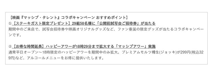 【映画『マッシブ・タレント』×ステーキガスト】コラボキャンペーン開催 〜2月9日“肉の日“から29組限定!「公開前試写会ご招待券」プレゼント〜