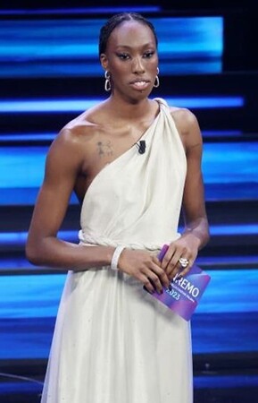 [2023年 2月 9日/サンレモ・イタリア] バレーボールのスター選手であり、活動家、作家、そしてポメラートフレンドでもあるパオラ・エゴヌは、「イコニカ」や「カテネ」「ヌード」「サッビア」のジュエリーを身に着け、イタリア・サンレモで行われた第73回サンレモ音楽祭の司会の一人として登場しました。
