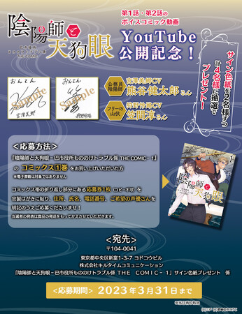 ・YouTubeにてCV:熊谷健太郎さん笠間淳さんのボイスコミックを公開! ・『陰陽師と天狗眼-巴市役所もののけトラブル係 THE COMIC-』コミックス第1巻は本日発売! ・熊谷健太郎さん&笠間淳さんお二人のサイン色紙プレゼントも! ・公務員陰陽師とフリーの山伏、異色の二人が織りなす もののけ×ファンタジー!