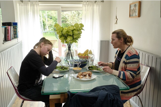 この度解禁された場面写真では、本作で親子役を演じた大女優ケイト・ウィンスレットと、実の娘であるミア・スレアプレトンが悲し気な表情でお互いを支え合うように抱き合っている姿。また、食卓で母を睨みつけている娘の姿や、話し合ったり、お互いを理解し合おうと努力をしている2人の様子が伺える画像も解禁となった。本作で思春期の娘と真剣に対峙し、苦悩する母を演じたケイト・ウィンスレット。大女優としてではなくごく普通の母親と変わらぬリアルな姿には、作品だという事を忘れて思わず引き込まれる。ケイトとミア母娘、本格共演の貴重な姿を是非本編でご覧ください。