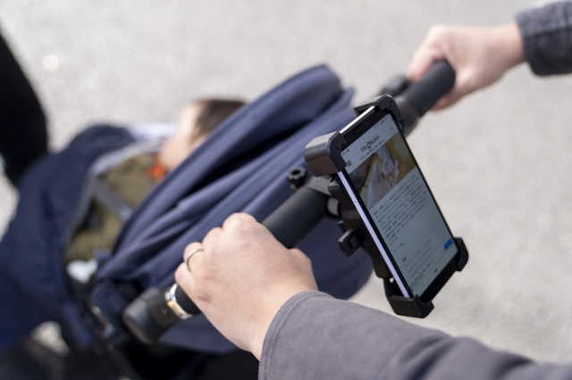 ベビーカーのハンドルに装着すれば、歩きながら通話ができる。