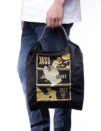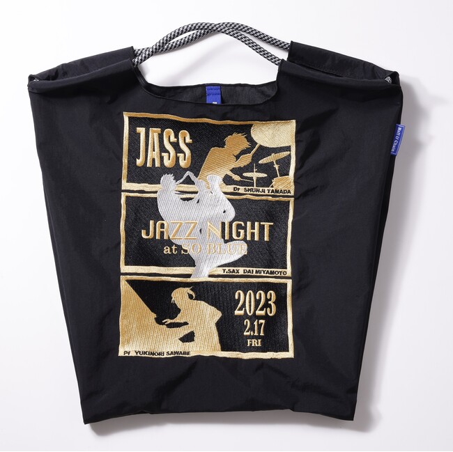 映画『BLUE GIANT』は、テナーサックス奏者の宮本大、ピアニストの沢辺雪祈(ゆきのり)、ドラマーの玉田俊二による、ジャズトリオ「JASS」の活躍を描く。このトリオのライブが現実に開催されたとしたら、販売されたライブグッズはどんなものでしょう。そんな想像から生まれたエコバッグがこちらです。