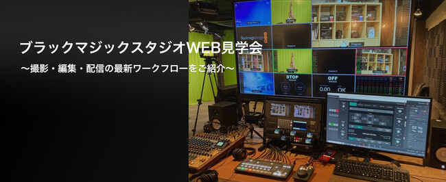 WEB見学会は、11月、12月に開催され、好評を博したスタジオ個別見学会を、今回はウェビナー形式で開催したものです。ブラックマジックデザイン社では株式会社PANDASTUDIO.TVの協力のもと、数多くのブラックマジックデザインの製品で構築されたスタジオをご用意いたしました。